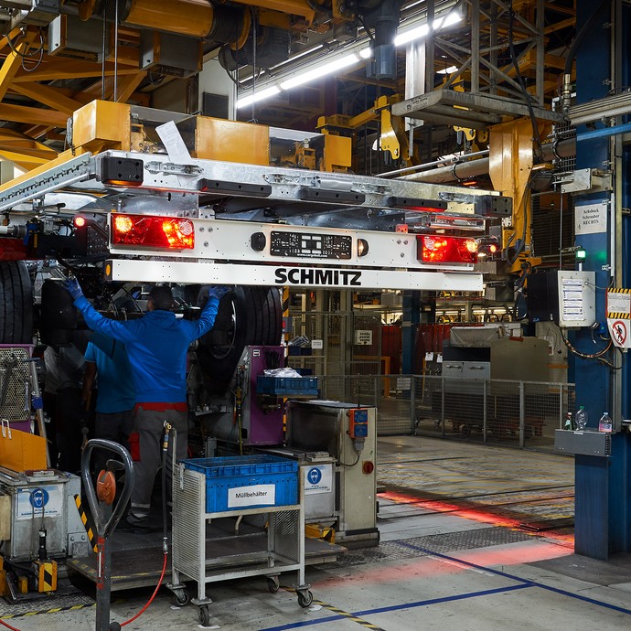 In der Halle sind viele Maschinen zum Transport der schweren LKW-Teile. An vielen Stationen stehen Arbeiter in grau-roter Arbeitskleidung.